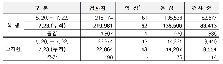 등교 이후 진단검사 현황 (7.24. 0시 기준)