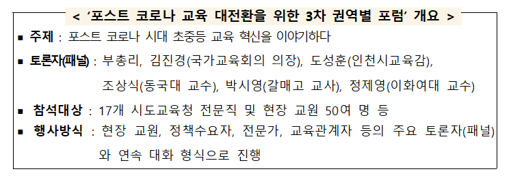 교육부(부총리 겸 교육부장관 유은혜)는 7월 29일(수) 09시 30분, 인천교육정보센터에서 포스트 코로나 교육 대전환을 위한「제3차 권역별 포럼 및 시도교육감 수도권 간담회」를 개최한다.
