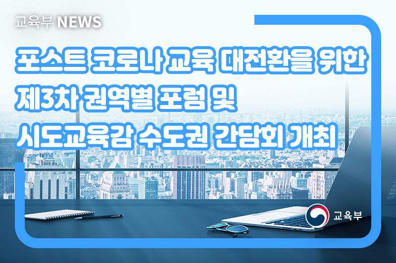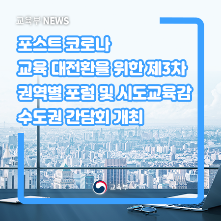 교육부(부총리 겸 교육부장관 유은혜)는 7월 29일(수) 09시 30분, 인천교육정보센터에서 포스트 코로나 교육 대전환을 위한「제3차 권역별 포럼 및 시도교육감 수도권 간담회」를 개최한다.