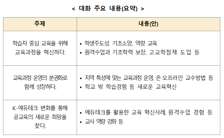 교육부‧국가교육회의‧시도교육청‧학교는 3개의 주제(학습자 중심 교육, 교육과정 분권화, k-에듀테크 변화)를 중심으로, 미래교육의 방향과 현장 변화를 이끌어낼 과제에 대해 함께 논의한다.