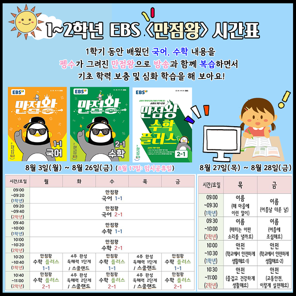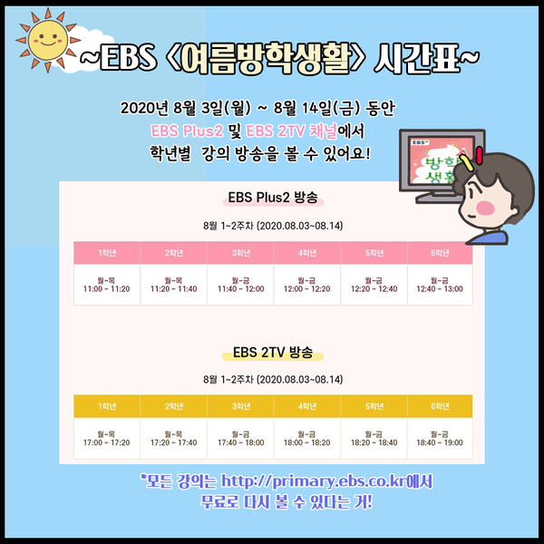 여름 방학 중인 2020년 8월 3일(월)부터 시작해 8월 14일(금)까지, EBS Plus2 및 EBS 2TV 채널에서 시청할 수 있어요! 방송 편성 시간은 다음과 같아요. 잘 기억해 두었다가 활용해 보아요!