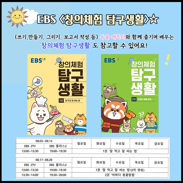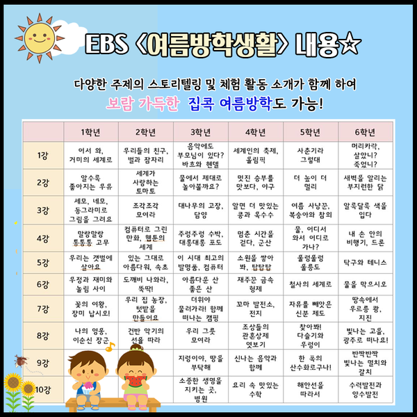 EBS 여름 방학 생활 프로그램은 초등학생 1~6학년 학생 모두를 대상으로 하는데요. 방송을 보면서 방학 중에도 자기 주도적으로 다양한 분야의 상식을 배우면서 체험 활동이 가능해요! 창의력, 탐구력, 사고력이 쑥쑥 늘어나는 방학이 되겠죠?