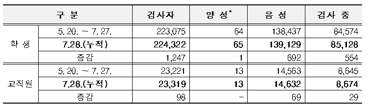 등교 이후 진단검사 현황(7.29. 0시 기준)