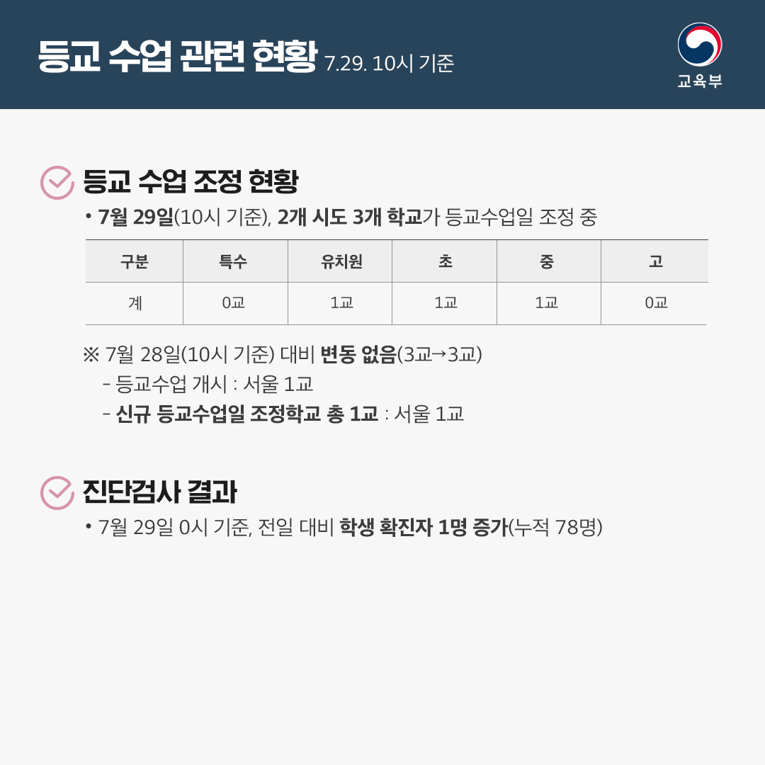 - 7월 29일 0시 기준, 전일 대비 학생 확진자 1명 증가