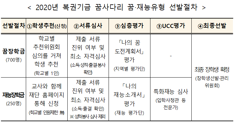 2020년 복권기금 꿈사다리 장학금은 총 3,011명(꿈 2,285명, 재능726명)의 신청을 받아, 서류심사‧심층평가 및 사용자 제작 동영상(UCC) 평가 등 4~5단계의 엄정한 심사를 통해 꿈과 재능을 보유한 저소득층 중‧고등학교 학생 950명을 선발하였다.