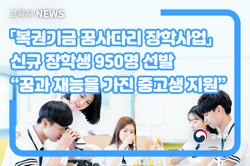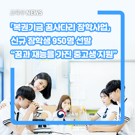 교육부(부총리 겸 교육부장관 유은혜)와 한국장학재단(이사장 이정우)은 7월 29일(수) 「복권기금 꿈사다리 장학사업」의 꿈‧재능유형 신규 장학생 950명을 선발하였다.