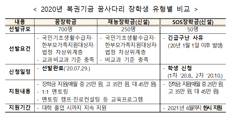 * 긴급한 위기상황에 처한 학생에게 한시적으로 장학금 지원, 올해 신설