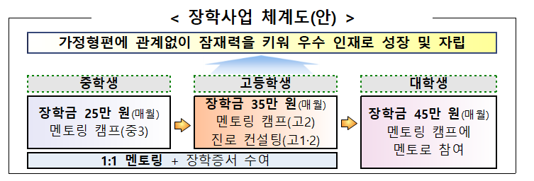 또한, 교육 프로그램이 장학생들에게 실질적인 도움이 될 수 있도록 진로·전공 맞춤형 멘토링 캠프를 진행하고, 진로 컨설팅 대상을 고1·고2로 확대하여 운영할 예정이다.