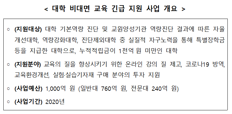 교육부(부총리 겸 교육부장관 유은혜)는 7월 31일(금) 「대학 비대면 교육 긴급 지원 사업(대학·전문대학 혁신지원사업 Ⅳ유형)」 기본계획을 발표하였다.