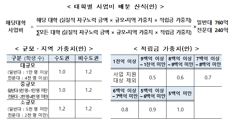 예산 배분은 대학별 실질적 자구노력 금액에 규모․지역․적립금 가중치를 곱한 금액을 전체 대학의 합계 금액 대비 비율로 배분한다.