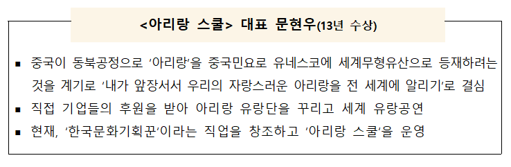 국민들에게 많이 알려진 역대 수상자에는 <국민 여동생> 문근영(06년 수상), <행복한 스케이터> 김연아(08년 수상), <악동뮤지션> 이찬혁(14년 수상) 등이 있으며, 이들은 각자의 자리에서 멈추지 않고 삶의 도전을 이어가고 있다.