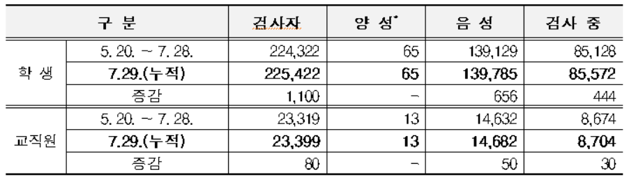 등교 이후 진단검사 현황(7.30. 0시 기준)