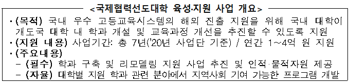 ㅇ 2012년부터 시작된 국제협력선도대학 육성지원 사업은 국내 대학의 우수 자원과 경험을 활용하여, 개발도상국 대학이 맞춤형 학과를 신설․개편하고 체계적으로 인력을 양성할 수 있도록 지원하는 사업이다.