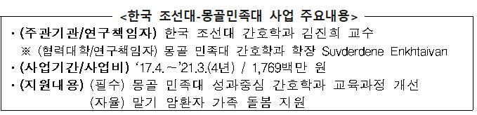 □ 교재를 개발한 조선대 간호학과 사업단(단장 김진희 교수)은2017년 사업에 선정된 이후, 몽골민족대학 간호학과 교육역량 강화와 지역 말기 암환자 가족돌봄 지원사업을 추진해 왔다.