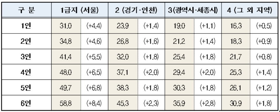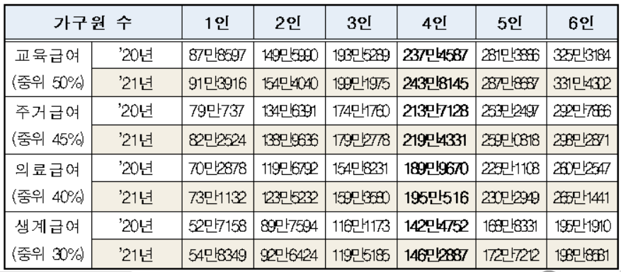 - 4인 가구 기준 생계급여 142만5000원 → 146만3000원, 주거급여 41만5000원 → 48만원 (서울) -