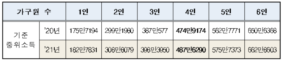 □2021년도 기준 중위소득은 4인 가구 기준으로 올해 474만9174원 대비 2.68% 인상된 487만6290원으로 결정되었다.