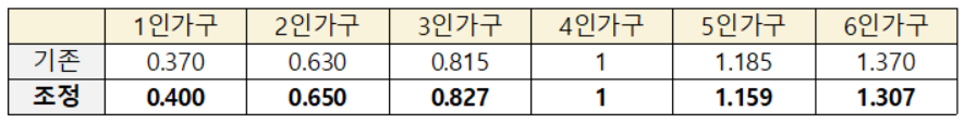 · 이에 따라, 중앙생활보장위원회는 가구원 수별 지출 실태를 고려하여 가구균등화지수를 아래와 같이 조정하기로 하였다.