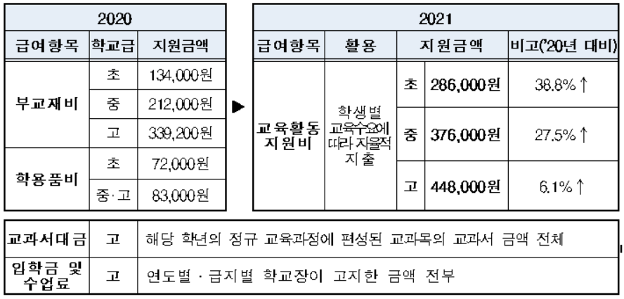 ○ 교육급여는 기존 항목중심의 지원에서 벗어나 원격교육 등 새로운 교육활동 수요를 고려하여 학생 개개인이 자율적으로 활용할 수 있는 교육활동지원비로 통합 지원한다.