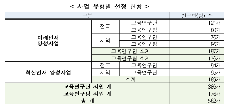 세부 사업 유형별로 미래인재양성사업에서 197개 교육연구단, 176개 교육연구팀, 혁신인재양성사업에서 189개 교육연구단이 선정되었다.