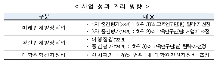 최종 선정된 교육연구단(팀)은 2020년 9월부터 7년간 사업비를 지원받게 되며, 사업 유형별로 중간평가를 실시하여 탈락 및 재선정, 사업비 조정 등이 실시될 예정이다.