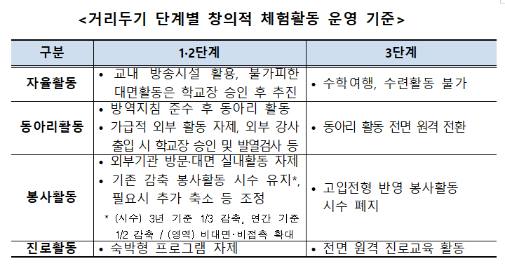 창의적체험활동을 포함한 각종 교육활동도 다양한 비대면 방법 등을 활용하여 적극 운영하되, 사회적 거리두기 단계에 따라 탄력적으로 조정‧운영할 수 있도록 하였다.