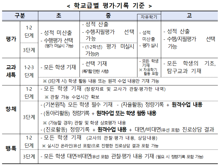교사와 학생의 평가 부담을 완화하고 학생부 기재 가능 범위를 확대하는 등 코로나19 상황임을 감안해 평가·기록에서도 최대한 유연한 운영이 가능하도록 하였다.