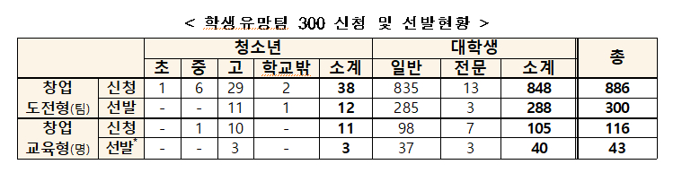 ‘창업 도전형’ 300팀은 전국 초‧중‧고‧대학(원)생 모두 참여 가능한 실전창업트랙 265팀과 대학원생이 참여하는 기술창업(실험실창업)트랙 35팀으로 선발되었으며,