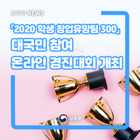 교육부(부총리 겸 교육부장관 유은혜)와 과학기술정보통신부(장관 최기영)는 한국연구재단(이사장 노정혜), 한국청년기업가정신재단(이사장 황철주)와 함께 「2020 학생 창업유망팀 300 온라인 경진대회」를 개최한다.