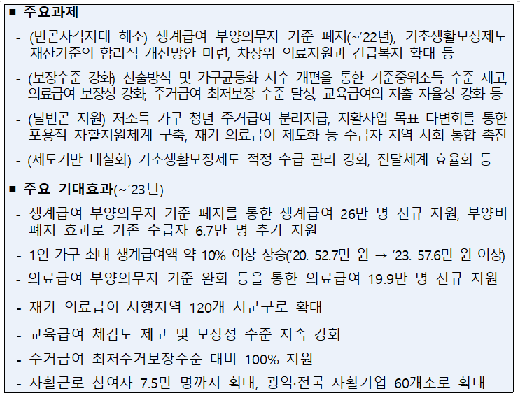 - 시행 20년 만에 생계급여 부양의무자 기준 폐지, 1・2인 가구 보장성 강화를 위한 가구균등화 지수 개편 등 빈곤 사각지대를 해소하고 보장수준을 확대하는 추진 과제 발표