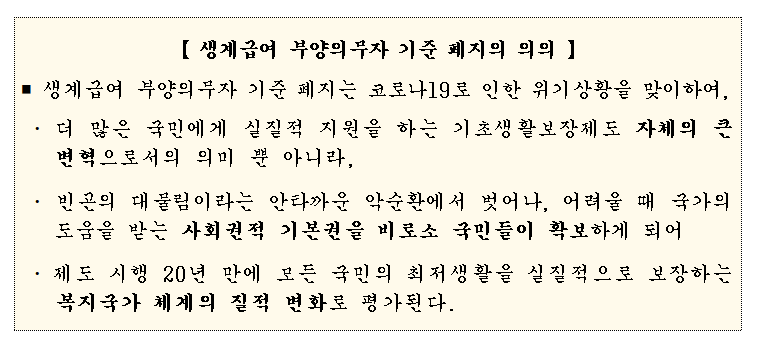 한편 생계급여 부양의무자 기준 폐지는 지난 7월 14일 대통령 주재 국민보고대회에서 발표된 한국판 뉴딜 종합계획의 고용・사회 안전망 강화 주요 과제에도 포함되어 중점 추진될 예정이다.