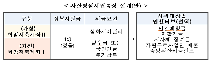 * 기존 희망키움통장 I, II, 청년저축계좌, 청년희망키움통장, 내일키움통장을(가칭)희망저축계좌 I, II로 통합