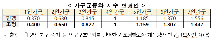 생활실태 대비 저평가되어 있는 1·2인 가구의 지수를 인상하는 등 가구균등화 지수를 변경한다.