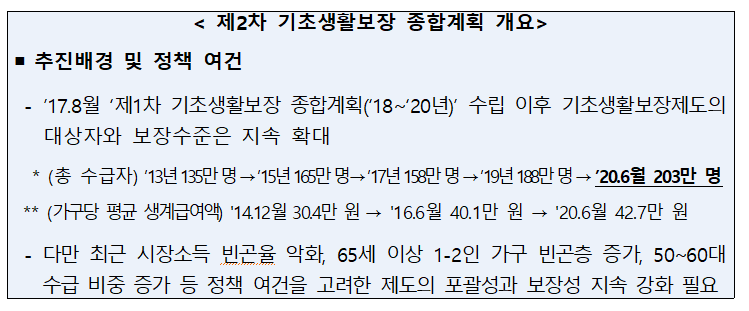 이러한 분석 결과와 현황을 토대로 마련한 ‘제2차 기초생활보장 종합계획(‘21~‘23년)’의 주요 내용은 다음과 같다.