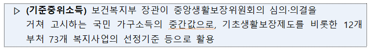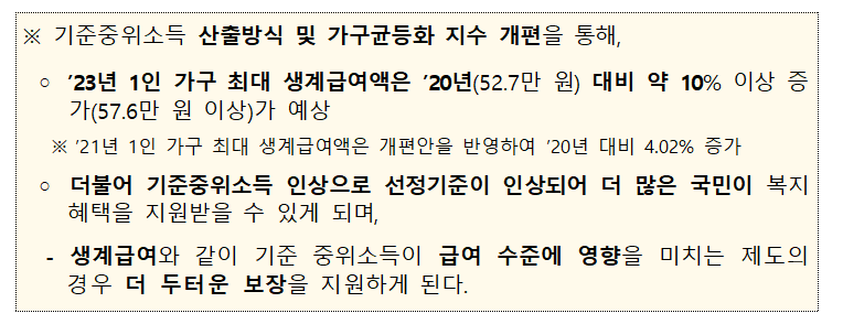 * 기준 중위소득보다 가계금융복지조사 중위소득 수준이 높아 기준 중위소득 인상 필요.(2018년 기준) 기준 중위소득 452만 원 < 가계금융복지조사 중위소득 508만 원(+12.5%)