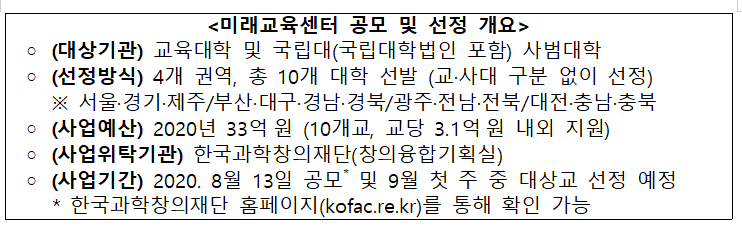 교대 및 국립대 사범대학을 대상으로 8월 말까지 공모를 거친 후 올해 10개* 대학을 선정하여 설치하고, 2021년 10개교, 2022년 8개교로 총 28개를 설치할 예정이다.