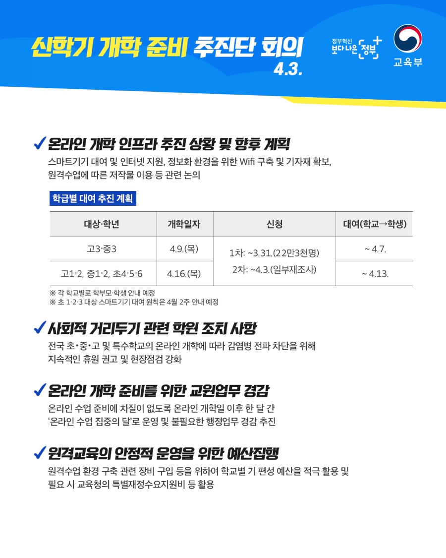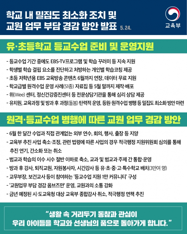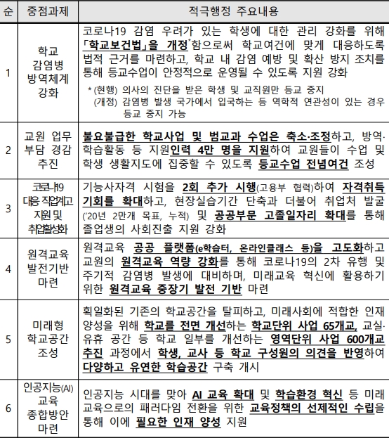 이에 따라 불요불급한 교육부 정책사업은 축소 또는 조정하고, 방역과 학습활동 등 지원인력 3.9만 명을 지원해 교원들이 수업, 방역 및 생활지도에 집중할 수 있도록 등교수업 전념 여건을 조성했습니다.