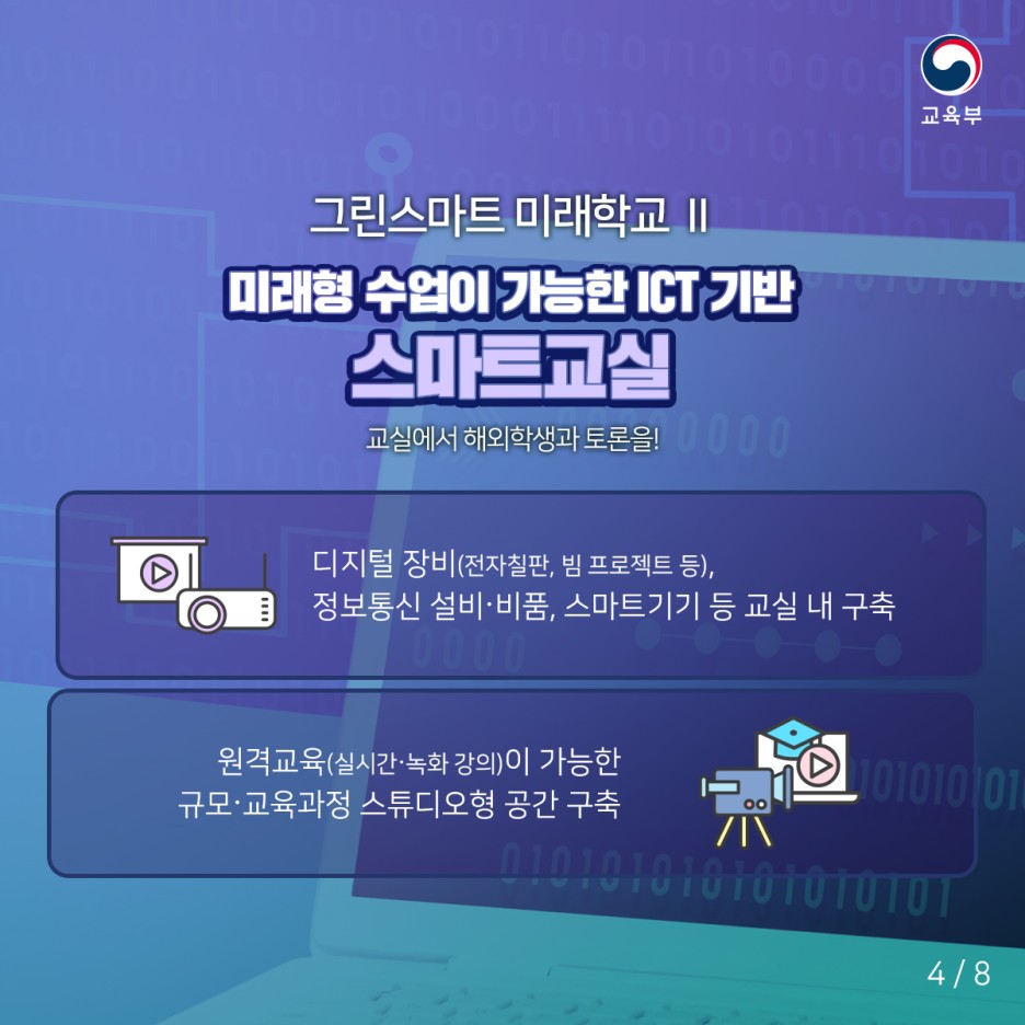 교육부는 이에 대응하여 획일화된 기존의 학교공간을 탈피하고, 미래사회에 적합한 인재양성을 위해 학교를 전면 개선하는 등 학생, 교사 등 학교 구성원의 의견을 반영하여 다양하고 유연한 학습 공간을 구축하고 있습니다.