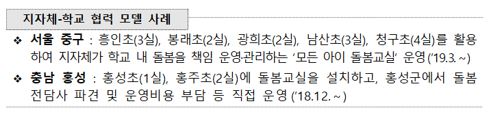학교와 지역사회가 연계한 수요자 중심의 돌봄서비스 구축을 위해 범부처 협업(교육부·복지부·지자체·교육청 등)을 거쳐, 초등학교에서 활용 가능한 교실을 제공하고 지자체가 돌봄을 운영하는 협력 사업을 추진한다.