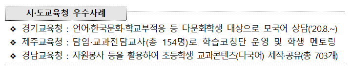 다문화학생에게는 한국어 원격수업 영상자료를 다국어(3개)로 제공하고, 집중적인 한국어교육이 필요한 학생은 2학기부터 1:1 또는 소그룹 맞춤형 대면지도를 추진한다.