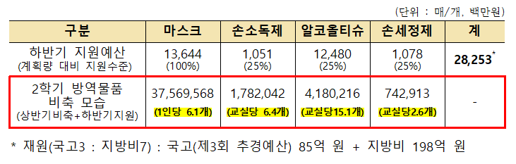 우선, 1학기에 이어, 2학기에 필요한 마스크, 손 소독제 등 283억 원에 달하는 방역물품 구입을 추가로 지원한다.