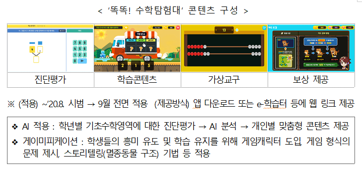 우선, 초등 1~2학년을 대상으로 인공지능(AI)을 활용하여 수학 학습수준을 진단하고, 개별 학습 데이터를 분석하여 학습 결손이 예측되는 영역에 학습 콘텐츠를 추천하는 게임 기반의 학습 관리 프로그램(똑똑! 수학탐험대)을 개발 보급한다.