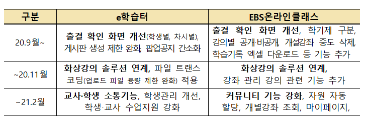 원격수업의 차질 없는 운영을 위해, 일일 300만 명이 활용할 수 있을 정도로 2개의 플랫폼을 안정화하고, 실시간 쌍방향 화상 강의를 할 수 있도록 단계적으로 개선한다.