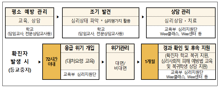 일반학생들은 모든 학생을 대상으로 상담·생활지도를 실시하는 등 사전 예방 중심으로 관리하되, 소통과정에서 필요하다고 판단될 경우에는 학교 내 위(Wee)클래스의 전문상담(교)사가 비대면 화상 상담 또는 채팅상담을 실시한다.