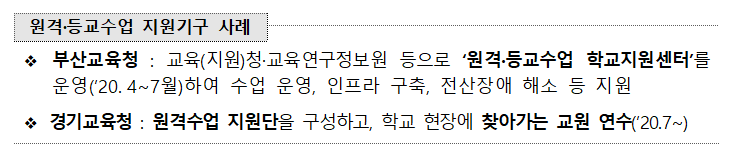 또한, 질 높은 학교 수업을 위해 강사요원, 핵심교원을 양성하고, 해당 교원들이 원격수업콘텐츠 제작 컨설팅, 찾아가는 교원 연수 등을 할 수 있도록 지원한다.