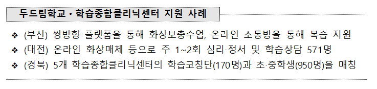 학교만으로 한계가 있는 경우에는 교육청 단위로 설치된 학습종합클리닉 센터(전국 130개소)를 통해 학습지도를 실시하고, 필요 시 외부기관과 연계한다.