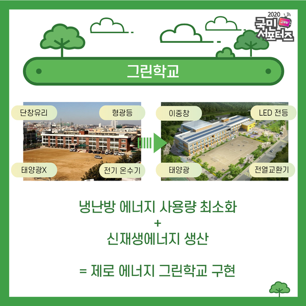 국내에서 사용되는 에너지 중 25%가 건물에서 사용되고 있다는 사실, 알고 계셨나요? 건물 외부에서는 외벽과 지붕 등에서 열 손실이 발생하여 많은 양의 에너지가 낭비되고 있고, 건물 내부에서는 난방, 냉방, 조명, 환기 등에서 에너지의 손실이 일어나고 있습니다. 그렇다고 조명을 켜지 않고, 냉난방을 하지 않는다면 학습에 지장이 생기니 에너지를 사용하지 않을 수가 없습니다.