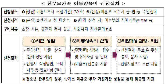 또한, ➀주민센터에서 출생신고를 위한 상담 및 법률자문 연계, ➁저소득층 한부모가족 지원, ➂건강보험 대상 포함, ➃사회복지 산관리번호 부여 등이 한 번에 이루어질 수 있도록 지원하고, 지자체 담당자 대상 교육도 강화한다.