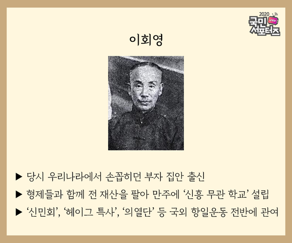 이회영의 집안은 당시 우리나라에서 손꼽히던 부자 집안이었습니다. 그와 그의 형제들은 자신들의 전 재산을 모두 팔아 독립운동 자금을 마련한 다음, 만주로 건너가 독립운동 기지를 세우기로 결심합니다. 그들은 만주에 도착한 후 ‘신흥 무관 학교’를 설립하여 독립군을 양성했습니다.