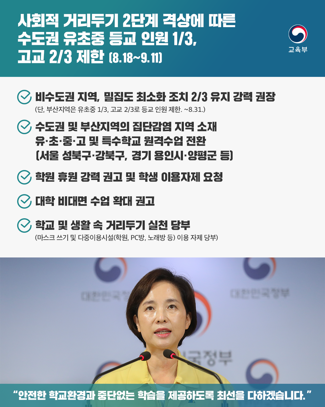 교육분야 후속조치를 마련하고 원격수업 전환과 강화된 밀집도 최소화 조치를 시행합니다.