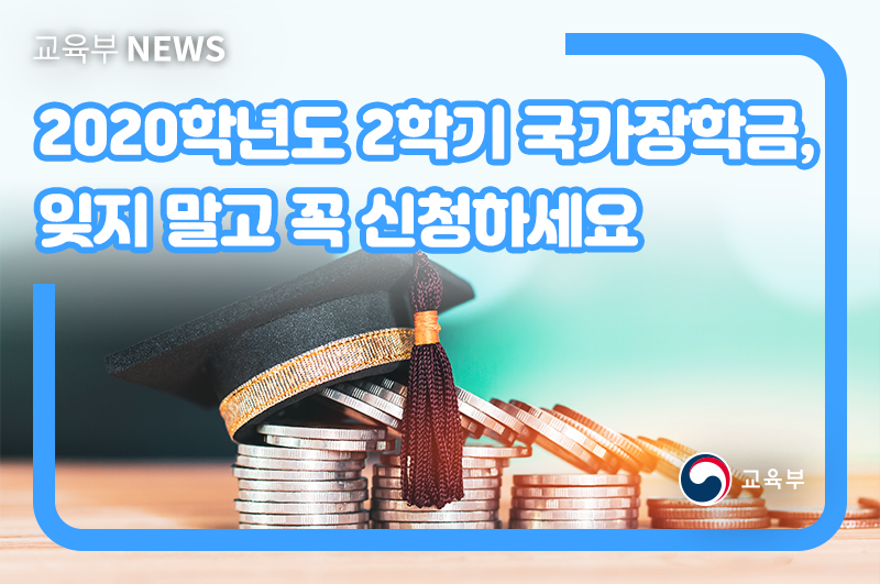 교육부(부총리 겸 교육부장관 유은혜)와 한국장학재단(이사장 이정우, 이하 재단)은 8월 20일(목) 9시부터 9월 15일(화) 18시까지 2020학년도 2학기 국가장학금 2차 신청을 받는다.
